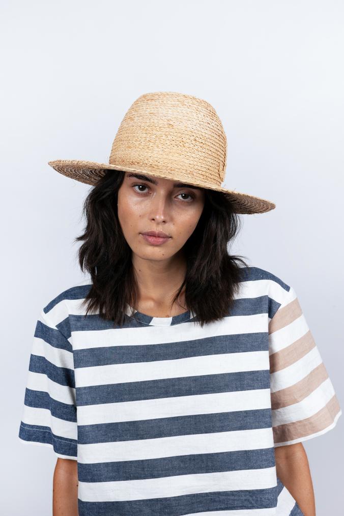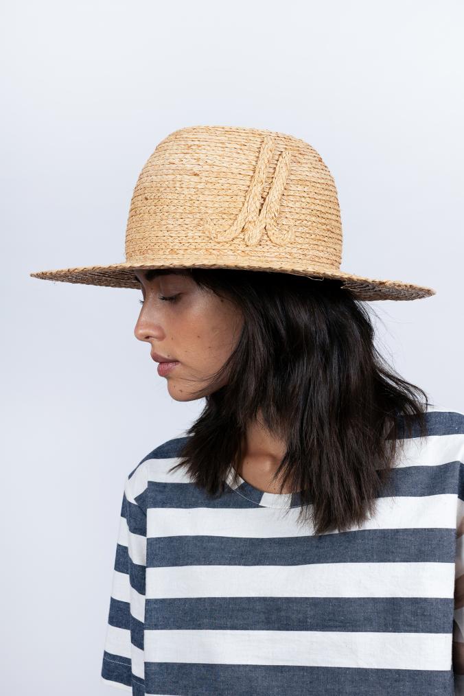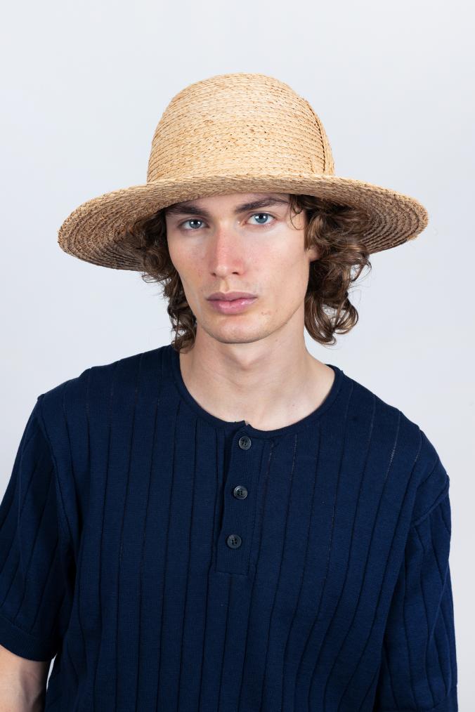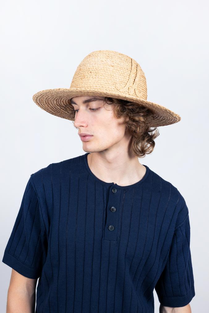 Das Mühlbauer-Modell Franco ist eine Fedora aus einer Raffiastrohborte. Die Borte wird zunächst zum Rohling genäht, dieser dann geformt. Der Hut ist mit dem geschwungenen Mühlbauer-M, handgenäht aus Raffiaborte, verziert. Zum Hut passend gibt es ein Taschenmodell (CASEY, M26107).