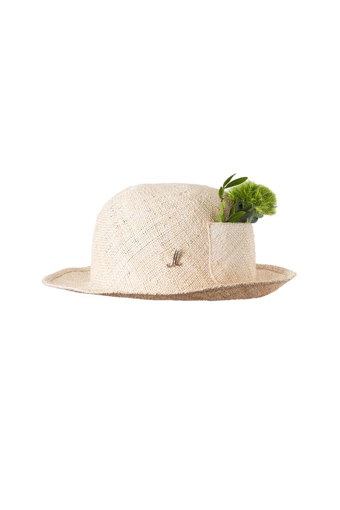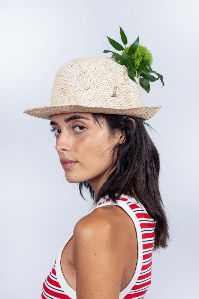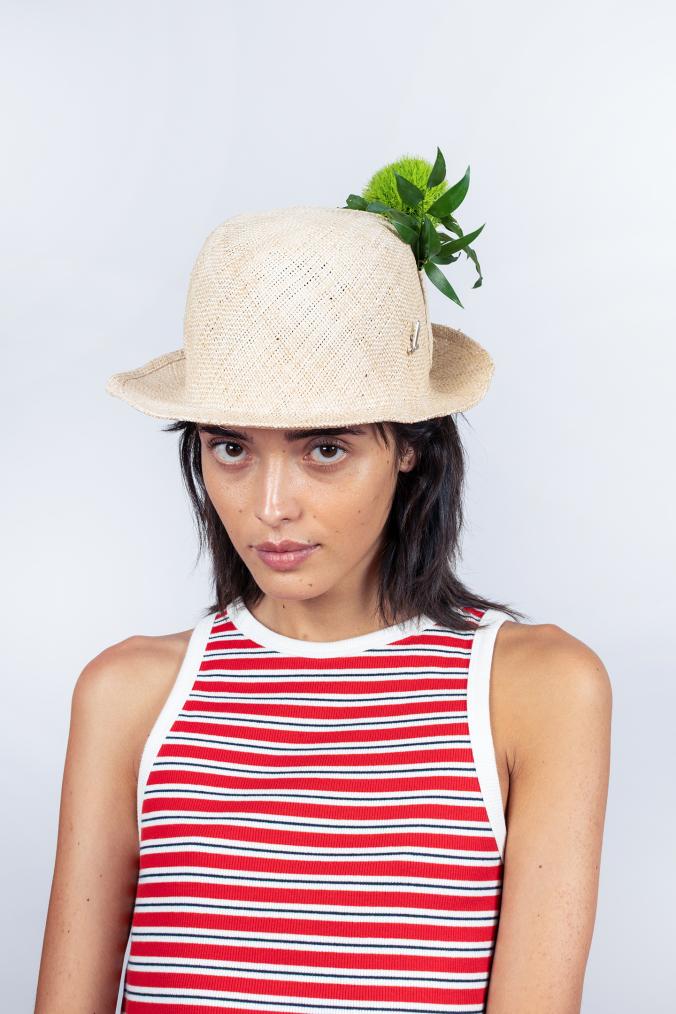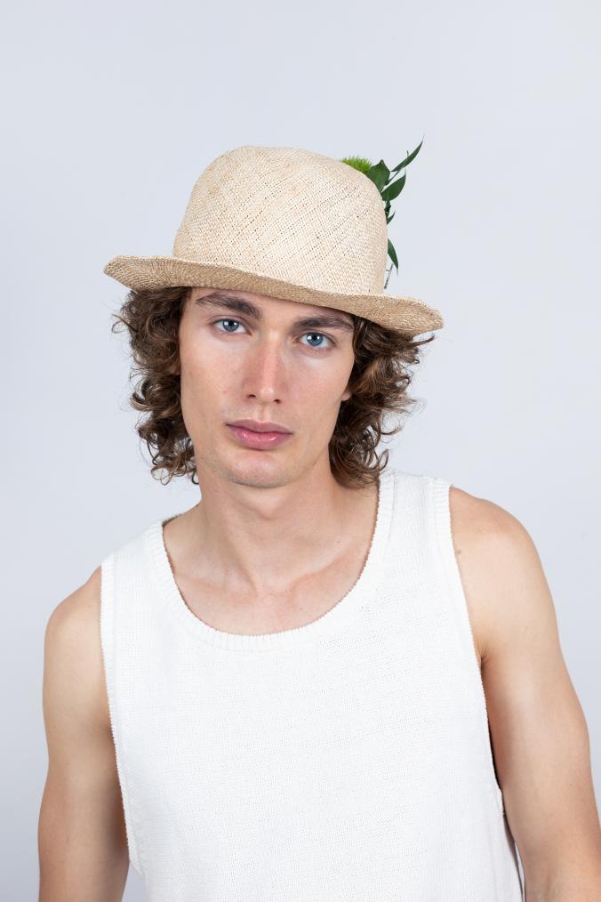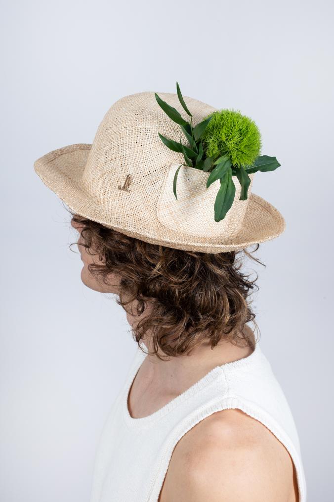 Das Mühlbauer-Modell Duke Theo ist eine Melone aus Baostroh. Baostroh wird aus dem Stamm des Affenbrotbaumes gewonnen. An der Hinterseite des Kopfes sind ähnlich Back Pockets von Jeans zwei Taschen fixiert, in die man Blumen oder Gräser stecken und damit den Hut ganz nach Belieben schmücken kann. Damit wird auch Bezug auf das Blumenthema der Kollektion genommen. Die Blumen auf den Hutbildern dienen lediglich der Veranschaulichung und werden nicht mitgeliefert.