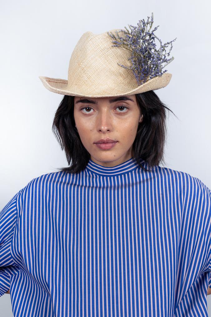 Das Mühlbauer-Modell Bert West ist ein Cowboyhut aus Baostroh. Bao wird aus dem Stamm des Affenbrotbaumes gewonnen. An beiden Seiten des Kopfes ist jeweils eine Lasche fixiert, in die man Blumen oder Gräser stecken und damit den Hut ganz nach Belieben schmücken kann. Damit wird auch Bezug auf das Blumenthema der Kollektion genommen. Die Blumen auf den Hutbildern dienen lediglich der Veranschaulichung und werden nicht mitgeliefert.