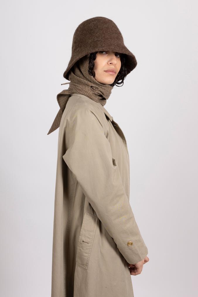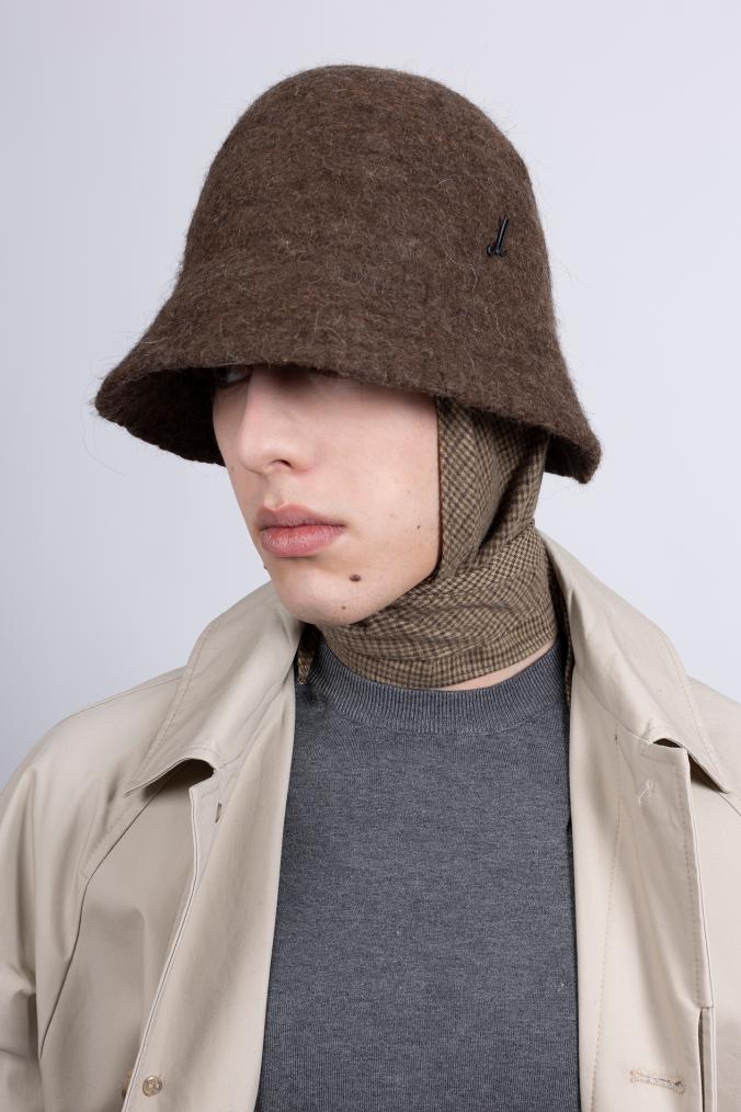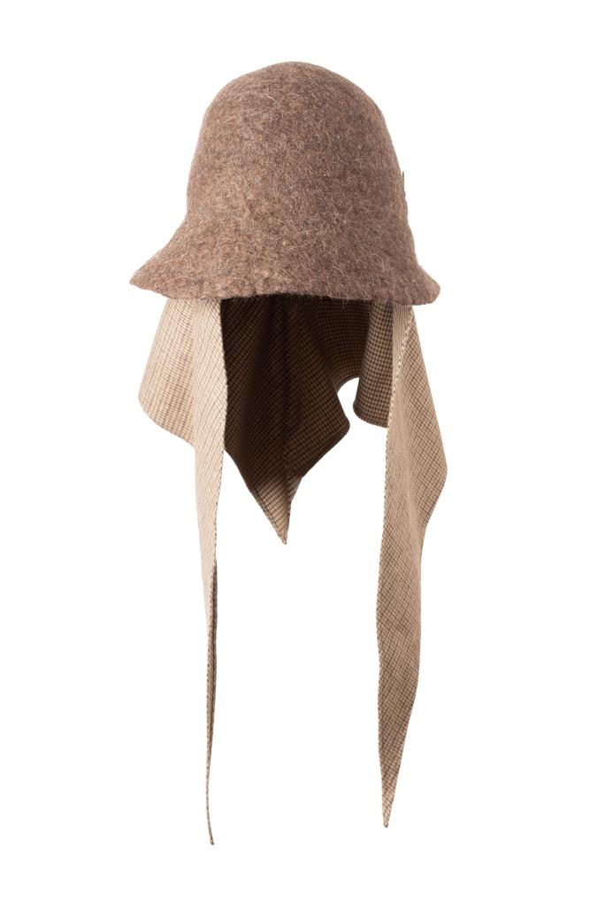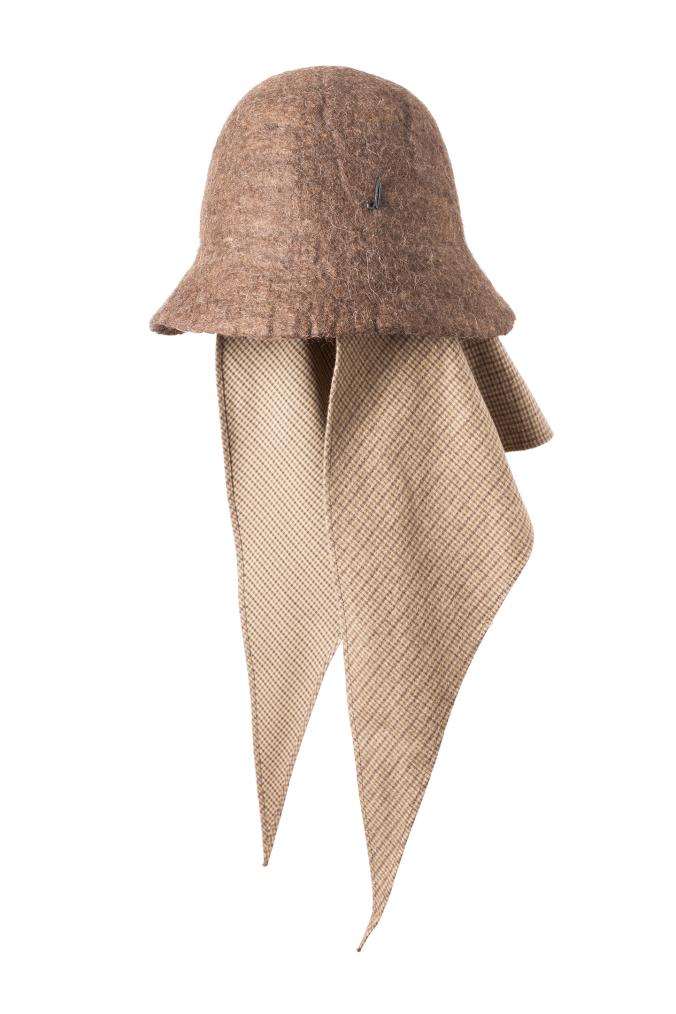 Das Mühlbauer-Modell Naja Grit ist eine schmalkrempige Cloche (Glockenform) aus handgefilzter Schafwolle. Das Erscheinungsbild dieses Filzes ist unregelmäßig, rau, uneben, dafür aber „lebendig“. Zudem ist diese Qualität warm und wasserabweisend. Das Modell kann gefaltet und in die Tasche gepackt werden und verzeiht auch, wenn man sich versehentlich einmal draufsetzt. An der Innenseite des Hutes ist ein Dreieckstuch aus einem karierten, angenehm flauschigen Baumwollflanell fixiert. Damit lässt sich der Hut um Kinn und Hals binden – praktisch, wenn es windig oder kalt ist. Das Tuch ist auch das zentrale Thema der neuen Kollektion, die den Titel „Cloth“ trägt.