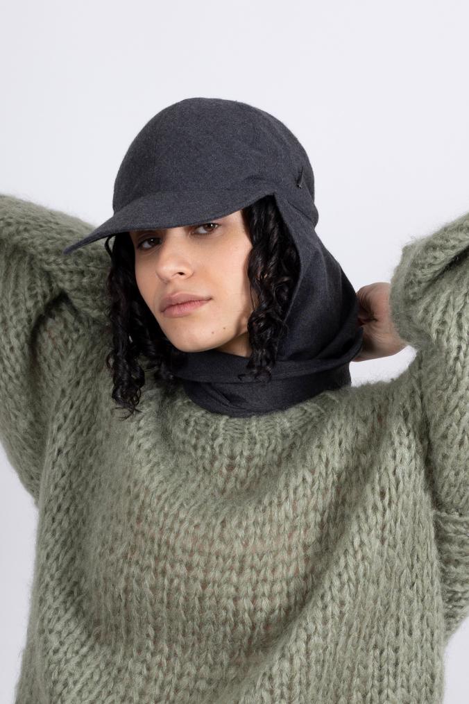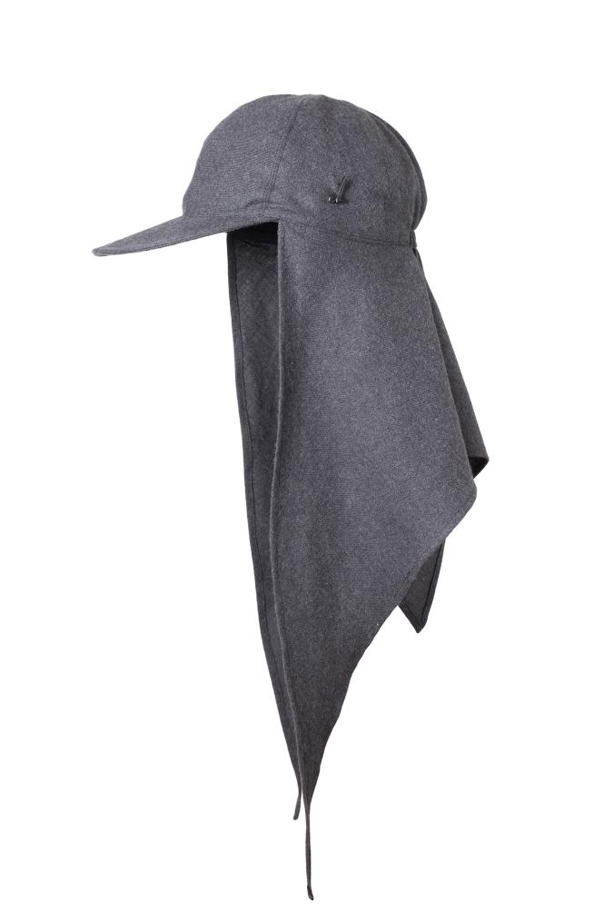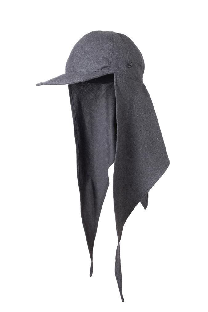 Das Mühlbauer-Modell Basil ist eine Kappe aus einem angenehm flauschigen Baumwollflanell. An der Kappe ist ein Dreieckstuch aus demselben Stoff fixiert. Damit lässt sie sich um Kinn und Hals binden – praktisch, wenn es windig oder kalt ist. Das Tuch ist auch das zentrale Thema der neuen Kollektion, die den Titel „Cloth“ trägt.